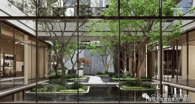 其中中央景观带约2000㎡,涵盖林下休闲区、阳光草坪、秘境水院,并设轻奢会客厅与家庭会客厅。