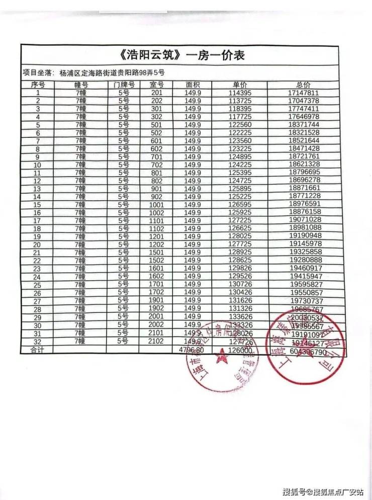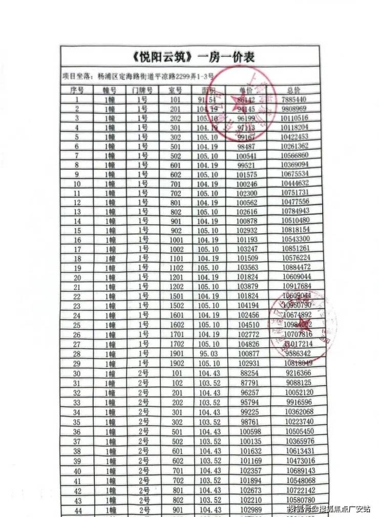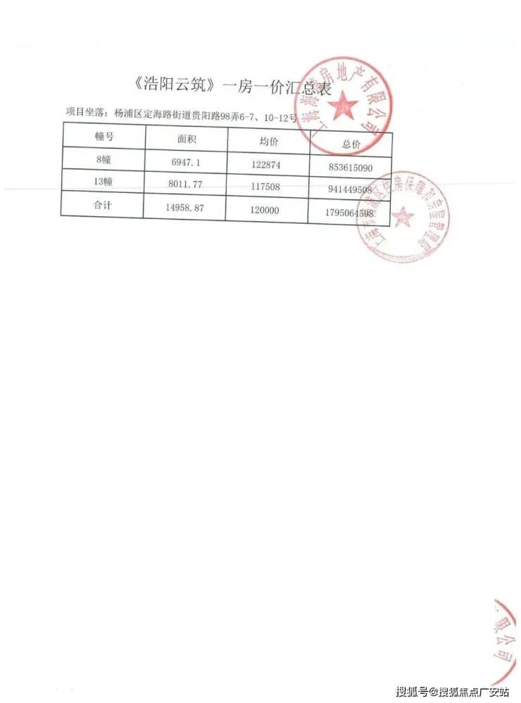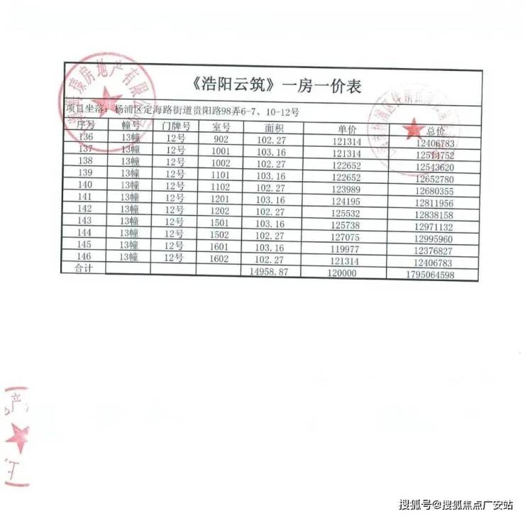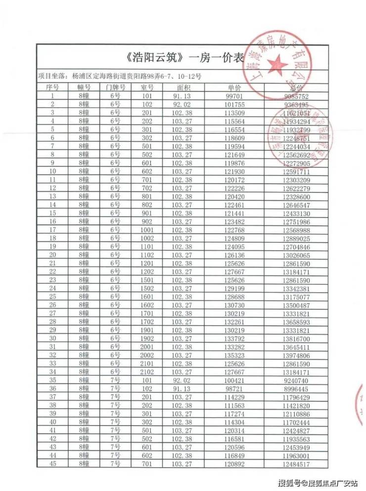 上期一房一价表如下:
