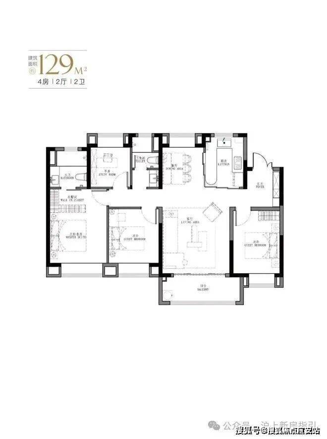 129㎡四房:四开间朝南,面宽达12米,双套房设计,宽景阳台,采光通风极佳