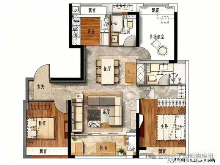 全卧带飘窗,其中北房间(多功能室)和南次卧的飘窗无墙,进一步拓展了空间利用率,可根据需求改造成书房、儿童房或休闲区等.主卧配备独立主卫,保障了主人的隐私与便利;南次卧和另一个卧室也能满足家人或客人的居住需求.