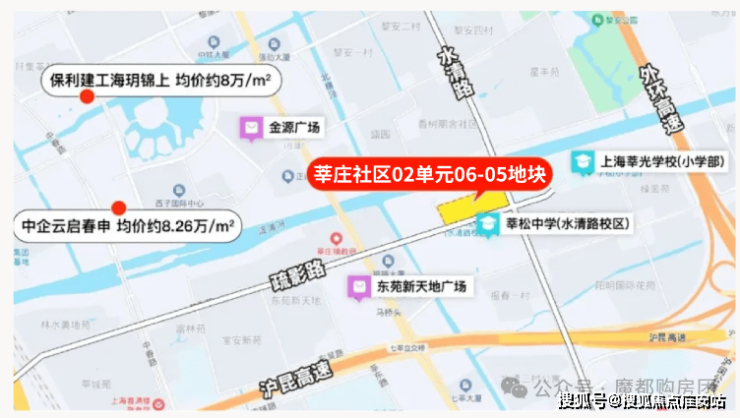 地块周边有莘松中学水清路校区和莘光学校,其中,莘松中学水清路校区就在该地块对面,这两所学校都是闵行区传统的公办名校,均建校超过30年.