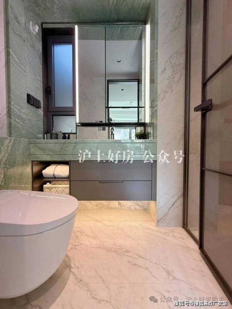 卫生间的洁具都是高仪零售款。主卫部分,目光所及之处几乎全是岩板,这个台面使用的浅绿色大理石也有个好听的名字“只此青绿”。
