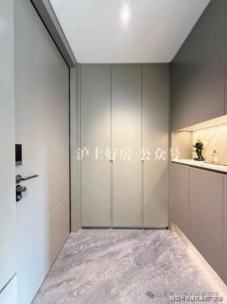 【国誉府】样板间做了F户型128㎡底楼复式和141㎡顶楼复式户型,其中建面约128㎡是三开间朝南户型,入户门从外头看是深色的,转入室内,为了统一视觉效果,门内改成了浅色。