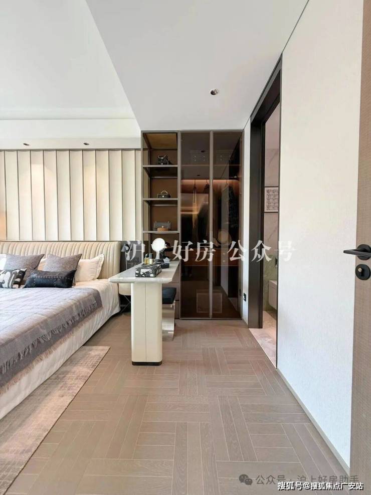客厅右手边链接主卧,国誉府这个128㎡是飞机户型,本身比动静分离的四房空间利用率要高一些,加上又是纯洋房,天然的高得房率,因此这个主卧尺度感非常好,比一般户型主卧更大、更方正,主卧床头背景墙也是交付标准。