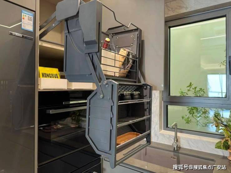 厨房收纳是小编觉得非常实用的款式。比如蒸烤一体机上方的橱柜做了一个下拉篮,下拉后的高度,一个一米六个子的人无需踮脚即可拿到东西。