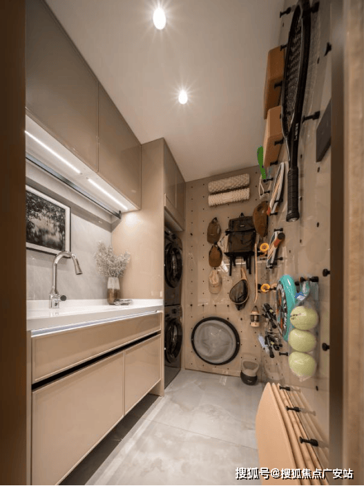 在不起眼的角落,藏着一处精细分区的家政空间。洗衣、烘干、熨烫、收纳,动线一气呵成。吸尘器、扫地机器人、家庭工具箱,皆有专属仓位。