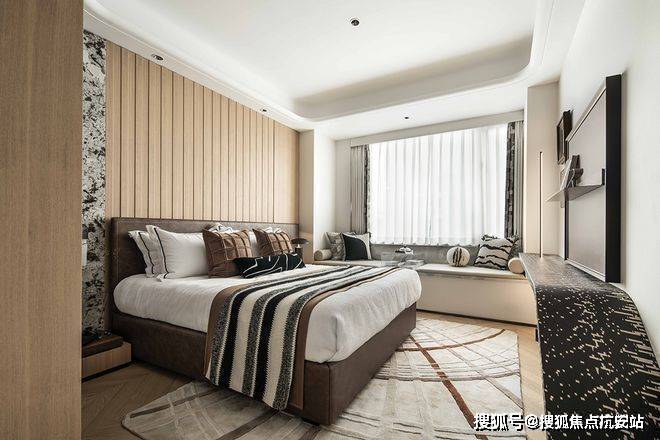 主卧聚焦居住者心里层面的私密感受。将不必要的元素剔除,留下简柔色块,柔和的光线和质感细腻的材质,使整个卧室显得温馨而舒适。床前的绿植和窗边的阅读角,为居住者提供了一个放松心灵的角落。