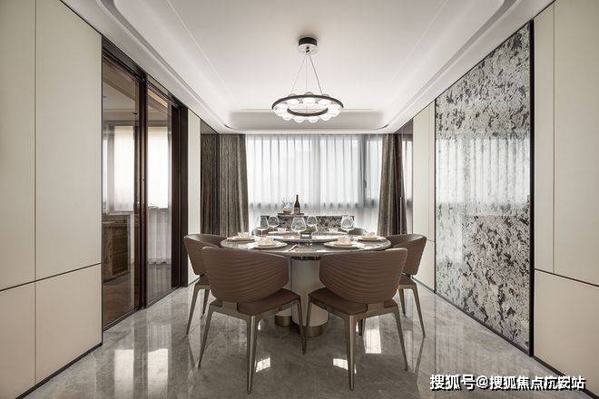 开放式布局让家庭成员间的互动关系更为多元,通透,敞明。波纹型墙面,让光线有了渐变缓冲。充满江南气韵的背景墙,叠加水墨纹理石材,让材质间产生微妙对话。