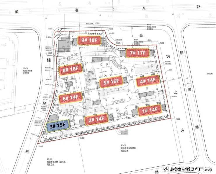 从方案来看,项目多为14-18F的小高层和高层住宅,非人车分流,部分楼栋首层有架空,东面有河道经过,南面规划了一处幼儿园用地(华发代建)。