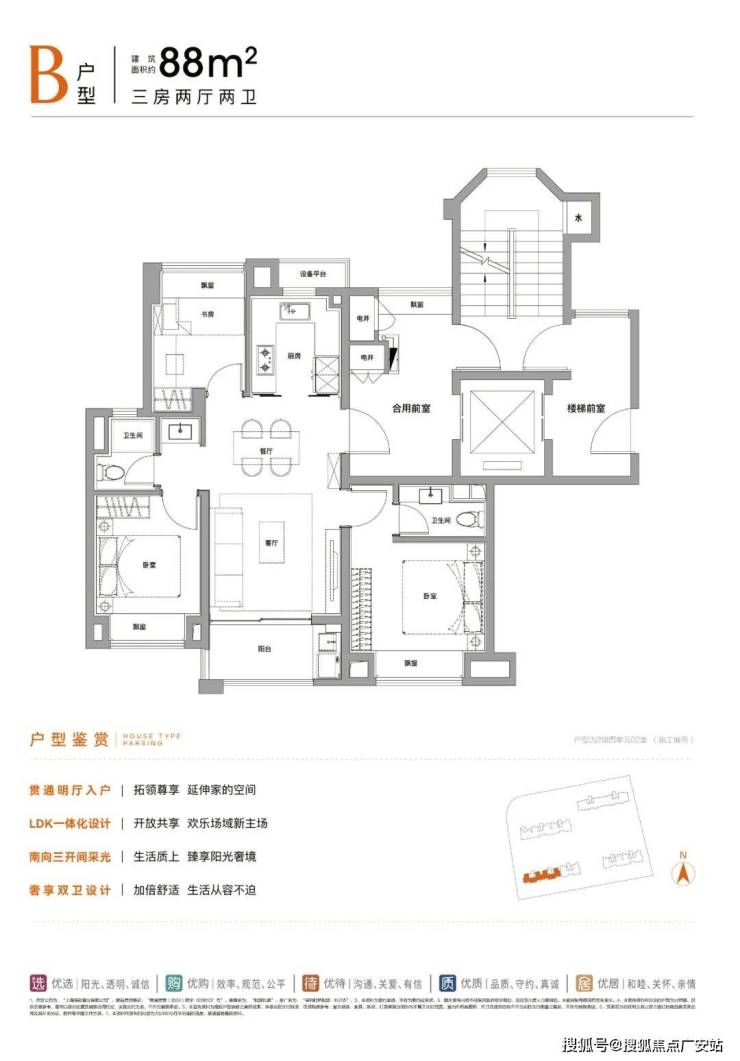 1、户型建面约88㎡3房起步,整个社区的邻里圈层更纯粹。再加上整体不大的体量,户均占有的景观、服务等资源都很高,小区走的小而精的路线。