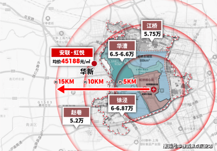 以虹桥火车站为圆点,10公里为半径,几乎所有板块新房价格都逼近甚至超过6万/㎡,4字头的华新甚至比二线辐射板块赵巷还要实惠!