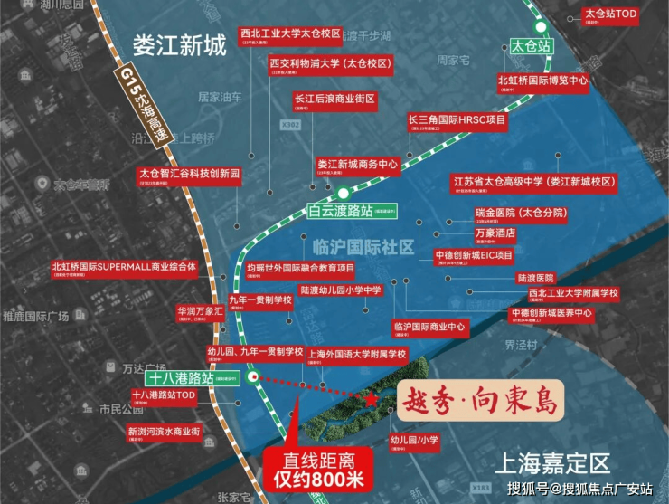越秀·向东岛位于上海嘉定区与太仓市交界处,南门为上海嘉定区、北门为太仓娄江新城,拥有上海新和路1558号和太仓富达路1号双城门牌号,生活半径归于上海。
