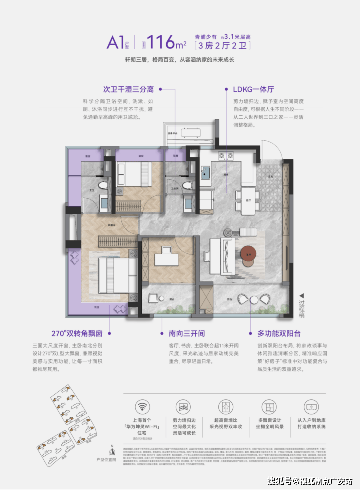 - 精装标准:铸铝门、岩板材质、唯宝智能马桶、中央空调+新风系统,层高3.1-3.3米,竖向收纳设计提升空间利用率。