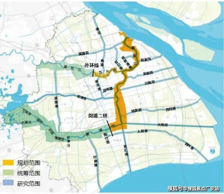苏州河沿岸地区规划范围为苏州河-黄浦江河口至外环高速,长度约21公里,进深约1-3公里,面积约27平方公里;统筹范围为外环高速至上海行政边界,长度约29公里,进深约2-8公里,面积约111平方公里。