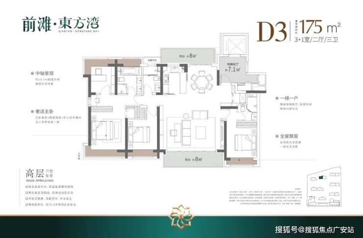 全龄段改善户型:103㎡3房起步,满足刚需到改善的不同需求;175㎡4房大户型,主卧套房带270°转角飘窗与独立卫生间,私密性佳