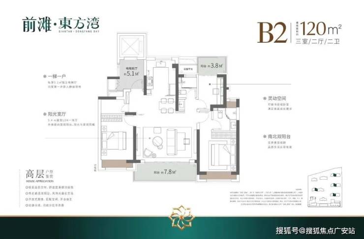 空间利用率高:层高最低3.1米,高于市场标准;双阳台设计增加使用空间;南北贯通LDKB布局,提升公区通透感