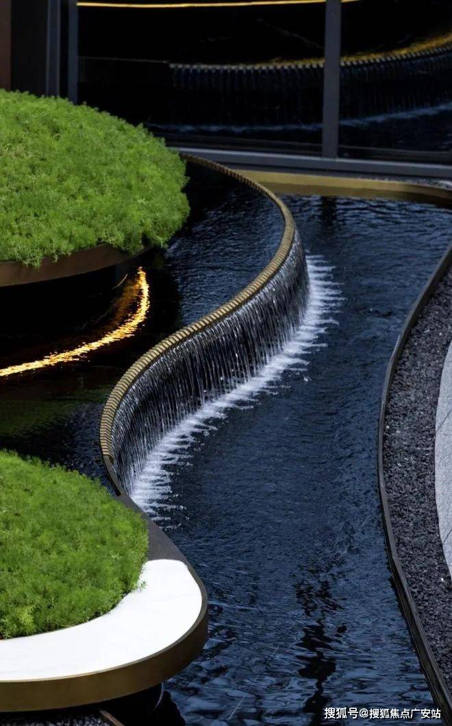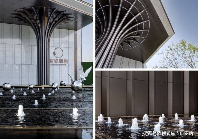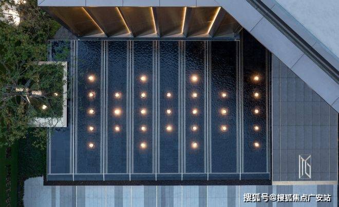 山墙的错动变化的肌理,形成了有节奏感、疏密有序的空间组合,加以灯光设计,夜幕之下,整体如星河璀璨,繁星点点。从地面拔地而起、蜿蜒攀爬在檐廊顶部的“伞”状形象建筑,搭配大面积的玻璃幕墙,昭示性地展现了一种传统的空间意象。开阔的水景映射出建筑与天际,镜面的效果使场景产生视觉错觉,让场地空间仿佛变得广阔无边。