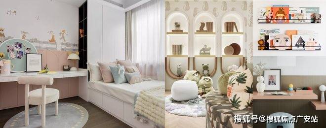 儿童房所在空间可进行“一”变“多”的自由变幻。约5.8米面宽,卧区+书房构成功能完善的成长系统,在瞰景飘窗远眺风景,在书房区努力学习,给孩子成长空间更多情景和志趣的共存。