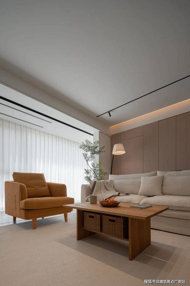 踏入客厅,首先映入眼帘的是那一片片温润如初的原木色系,原木画框里的是生活剧场 。拆除传统电视墙的厚重感,设计师用隐藏门和护墙板的沙发背景,+白色悬浮电视柜重构空间比例。地板与立面统一的橡木纹理,如同铺展开的自然画卷,既实用又不失美感。
