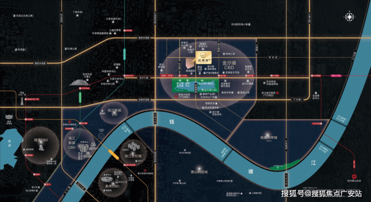 核芯区,一脉承接钱江新城、钱新2.0,承载钱塘区大量企业总部需求的同时,又可坐享核心地段的环湖高光配套赋能,杭州第四座CBD-金沙湖商务区已然成形。