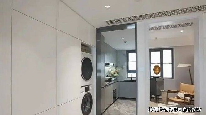还有一整面墙的收纳,两台博世嵌入式大冰箱,一台博世洗衣机,一台博世烘干机,上面一整排还打造了储藏空间。