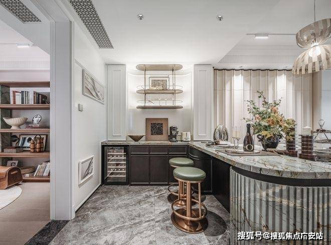 公区打造更是媲美奢华酒店,不仅有颜值,更有着满满的仪式感。嘉佩乐酒店风格的归家门厅,海派元素充满空间的每一个角落,地面的复古花纹,金属镂空装饰墙,普拉达绿的奢石点缀,仿佛穿越到了摩登时代。