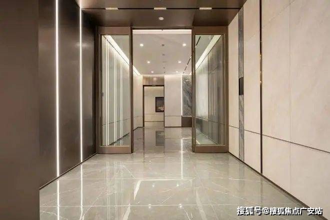 其次,项目还设置了无触入户大堂设计理念的首层单元门厅,业主人脸识别,即电动门自动打开。门厅的墙面两侧屏风为铂金钻石材重点装饰,顶面为曲面悬浮吊顶,给业主高端住宅般的归家体验。