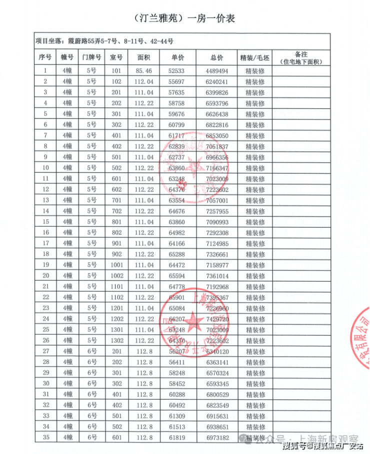 上期一房一价表如下: