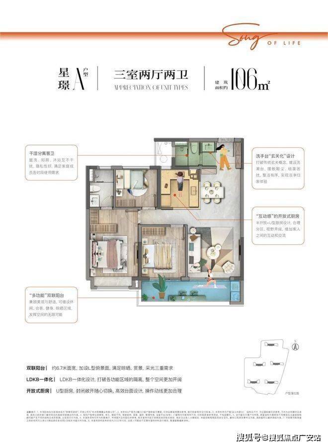 约106㎡户型点评:双联阳台约6.7米面宽,加设L型俯景面,满足晾晒、赏景、采光三重需求,LDKB一体化设计,打破各功能区域的隔离,整个空间更加开阔,开放式厨房 U型厨房,封闭敞开随心切换,高效台面设计,操作动线更加合理