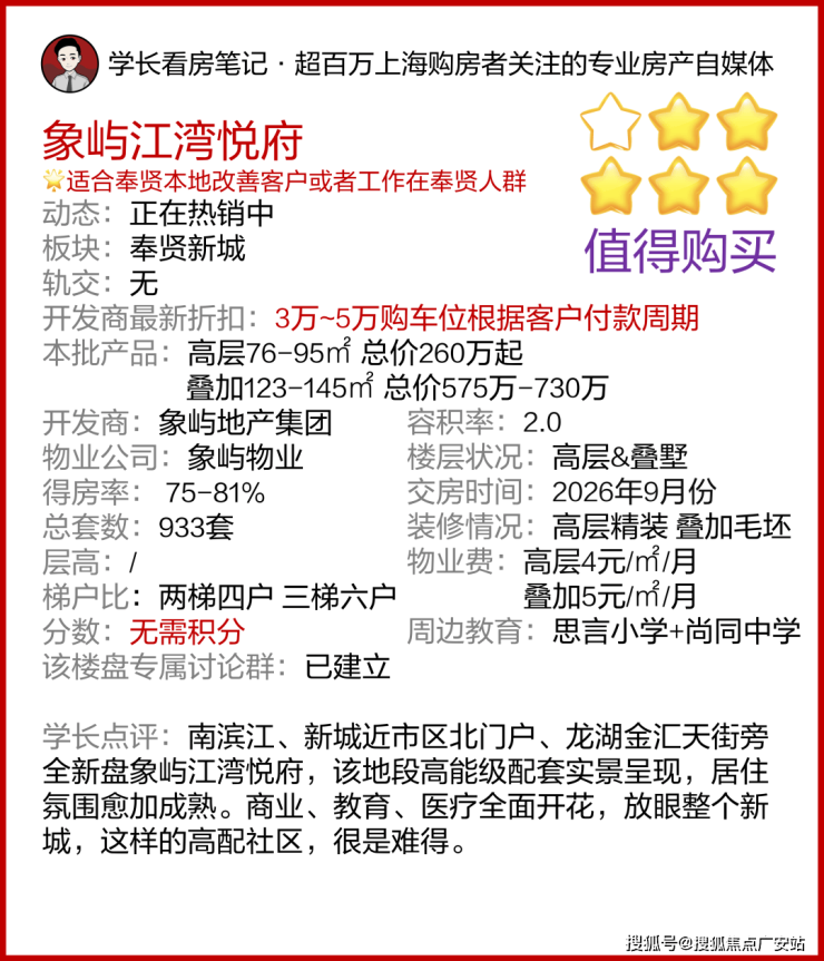 总体来说,区位上项目位于奉贤新城15单元金汇住区,同时也是奉贤新城最靠近市区的区域,既有龙湖天街还有上大九年一贯制学校,性价比还是挺高的 。唯一缺点在于没地铁,比较适合自驾通勤的市区外溢和本地刚需。但轨交上也有利好奉贤线,只是这条线路暂时被“搁置”,还需要时间。比较适合大浦东自住乃至市区拆迁客户养老的更优选择。