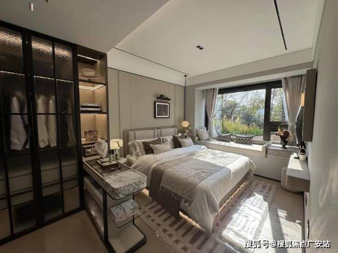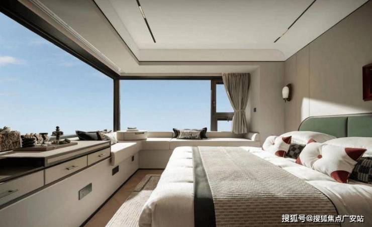 其中主卧的270°转角飘窗就有约5.7m²,通过与外立面的结合,直接做了梳妆台和储物柜,拓展了飘窗的实用性。