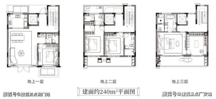 建面约240㎡的中间套:同样是大四房格局,二三楼都有宽约8.9米的跑道式阳台,四季美景循环播放。