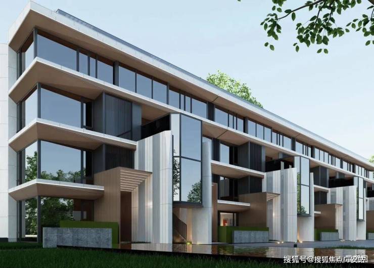 建筑风格:现代简约立面,玻璃幕墙+石材,宽楼间距,低密墅区质感