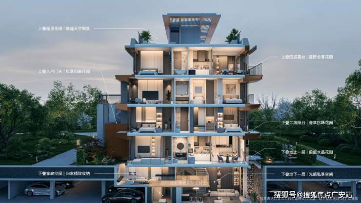 下叠:约5.45米可做跃层地下室,多个采光天井,还有南花园。