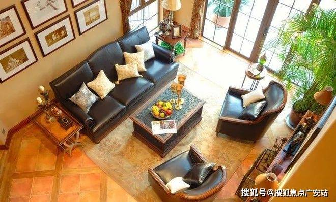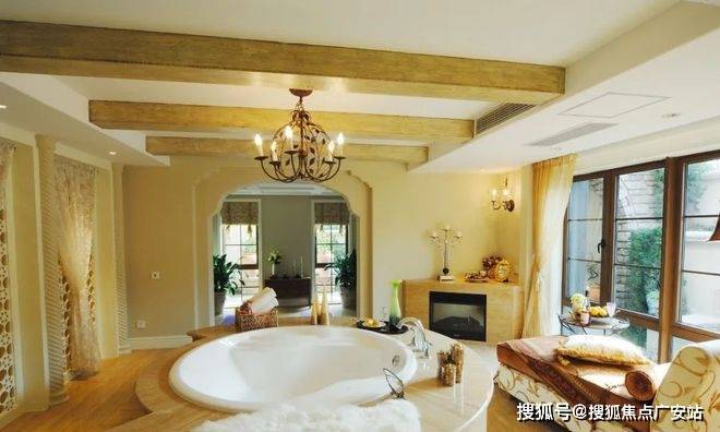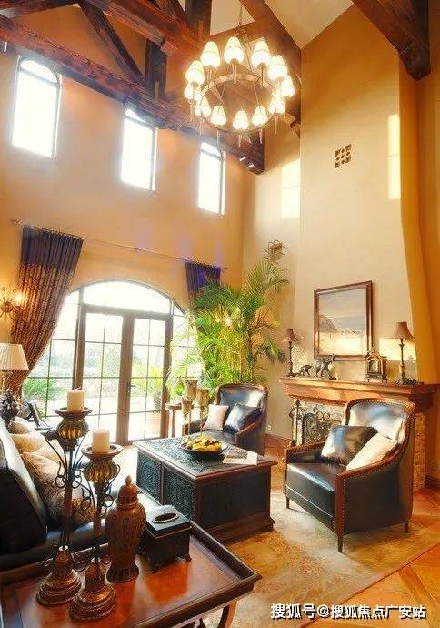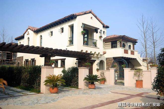 采用美国南加州风格,外立面为淡黄色手工抹灰(Stucco)搭配红瓦屋顶,融入原木、铁艺、烟囱等元素。