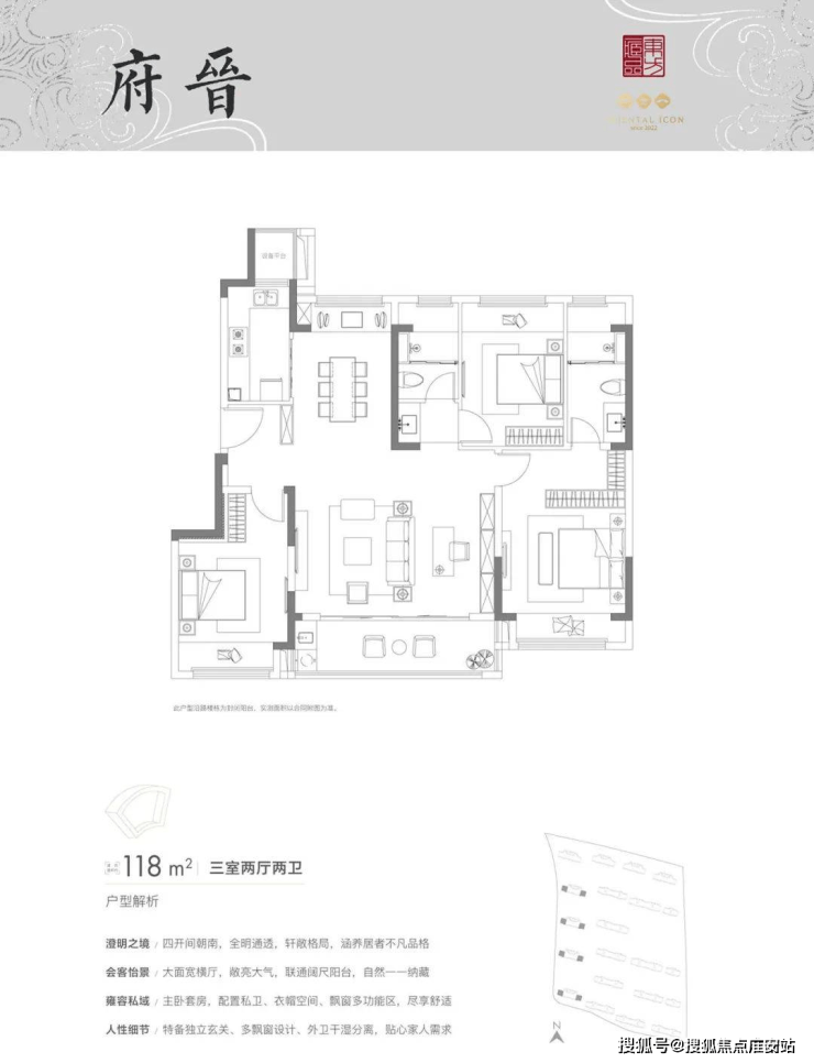 118㎡三房两卫:5.7米横厅+独立餐厅,全屋6飘窗,得房率86%