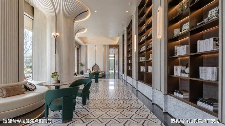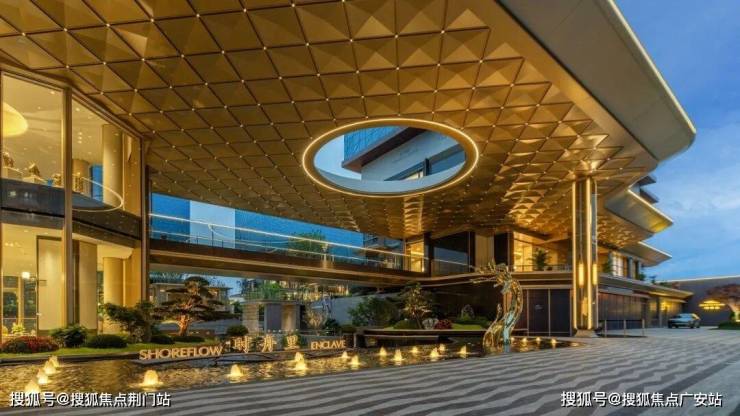 与这两年流行的“阔绰”门头相比,这座鎏金门头最大的亮点是通透——不仅顶部有一个圆形的镂空,偏置的大堂也为风景让了路,正前方没有任何遮挡,反而把最精彩的立体花园化作一幅动态图景,点缀了整条街道。
