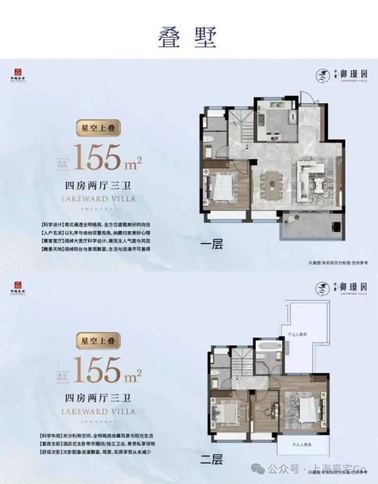 洋房155㎡四房两厅两卫采用四叶草户型,南北通透,双套房配置;叠墅赠送花园、露台,得房率达88%-90%