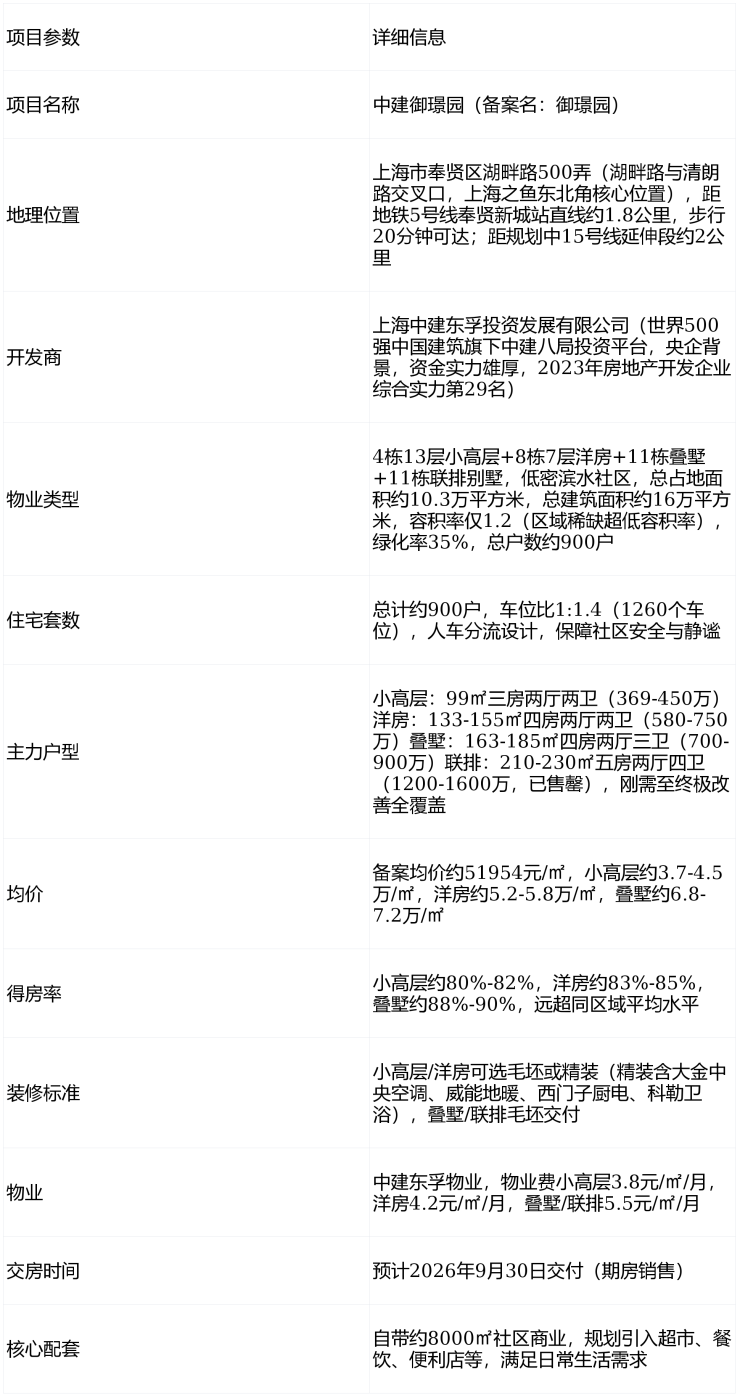 中建御璟园是奉贤新城上海之鱼板块的低密滨水社区,核心价值在于央企交付保障+1.2低容积率+双生态轴环绕+全龄户型的组合优势,适合预算369-1600万、追求低密湖居环境与居住品质、改善型需求的家庭,尤其适合在奉贤东方美谷产业园、闵行、徐汇工作生活的客户。
