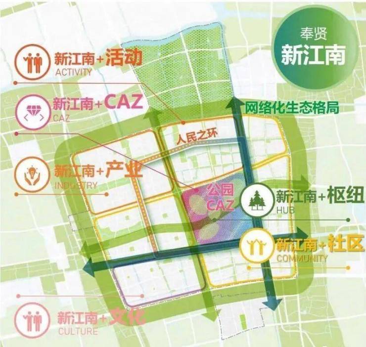 ●核心区:围绕上海之鱼和中央公园打造奉贤新城中央活动区CAZ,按上海副中心的能级建设新城中心,吸引先进制造业的企业总部、研发中心、运营平台集聚,促进体育产业、健康产业、文化产业形成特色,加快推动高能级生产性服务业和高品质生活性服务业发展。