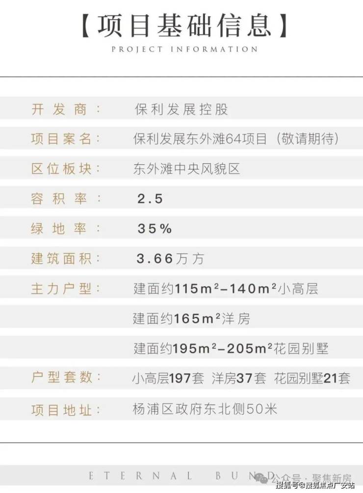 项目详情项目全称保利・外滩曜(备案名:待定)开发商保利发展控股(项目公司:上海保利建锦置业有限公司)项目位置上海市杨浦区怀德路、惠民路、许昌路、济宁路围合(东外滩内环CAZ核心)核心指标总占地约1.77万㎡,总建面约3.7万㎡;容积率2.5,绿化率约35%(以官方公示为准);规划1栋10层小高层+3栋17层高层+3栋风貌叠墅,总户数255户;车位配比1:2.2,70年住宅产权物业保利物业,物业费约9-11元/㎡・月,24小时管家式服务交付时间预计2028年3月精装交付(小高层),叠墅部分毛坯/精装可选