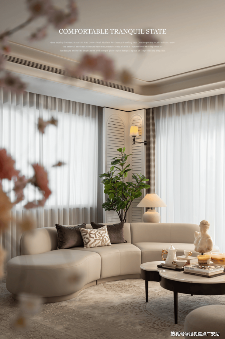 落地窗增加室内的明没效果,白色沙发柔软舒适,精致的地毯和清新的绿植,都是美好生活具象化表达。