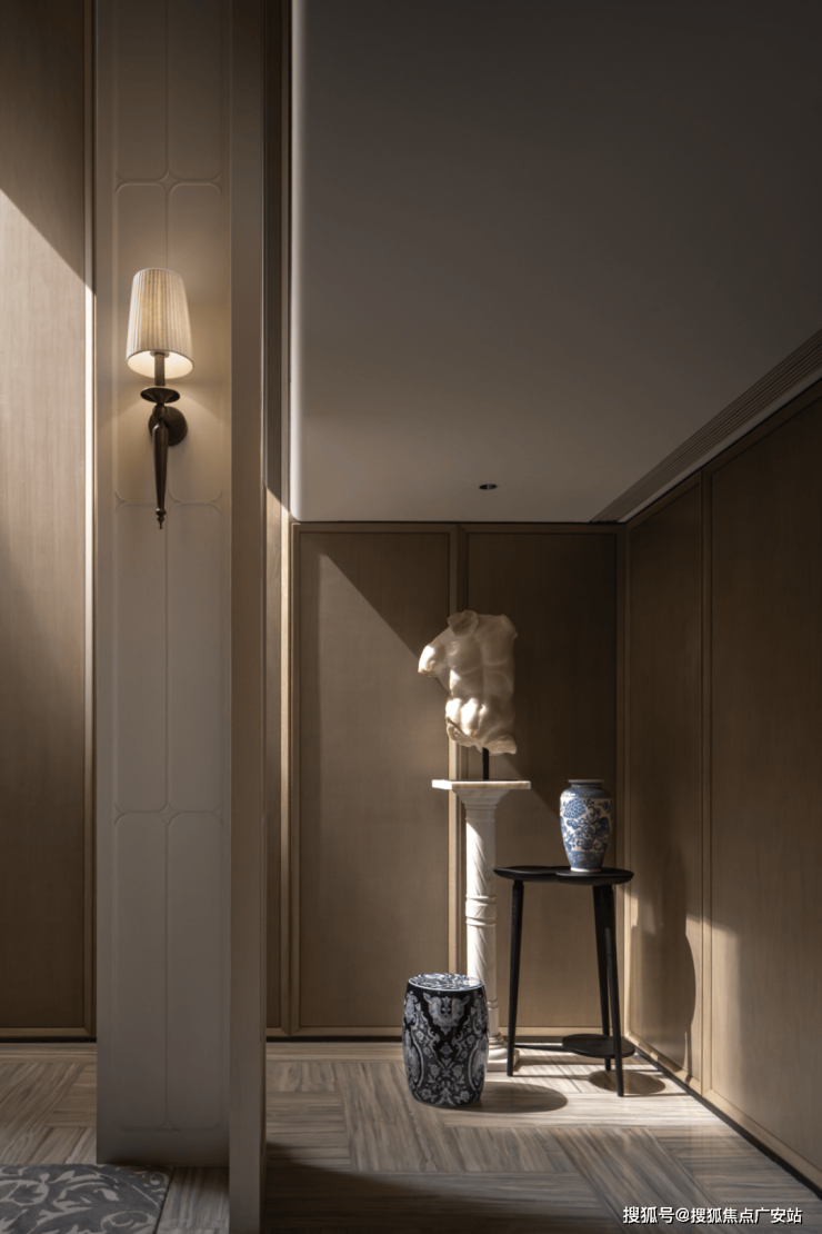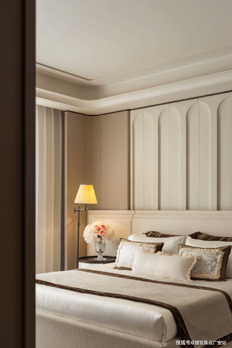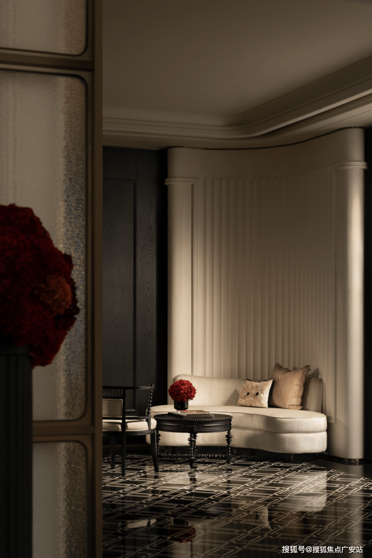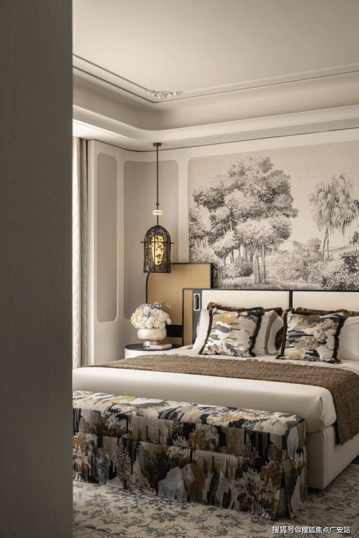 天花板为法式的圆弧设计,墙面背景为中式的沉稳大气,不同细节的组合方式彰显治秩序,也融入不同文化精髓。