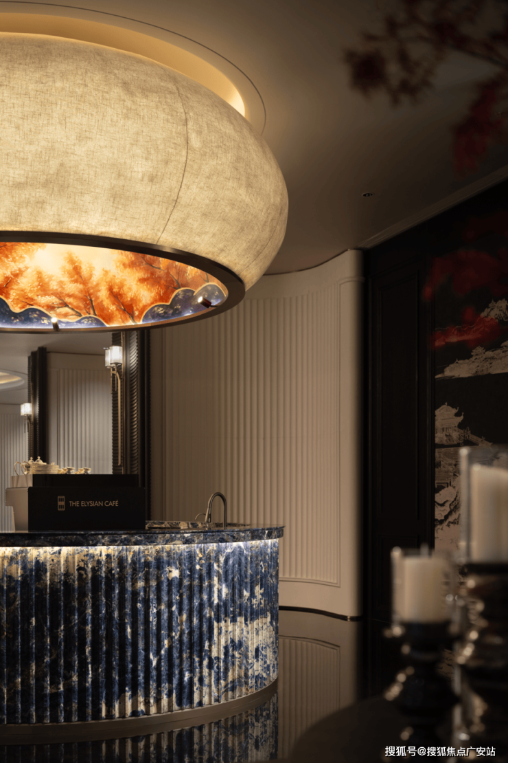 来到水吧区域,这里的中式艺术更加精彩,仿佛是陶瓷一般的图案,也有着湖水的模样,自然和艺术融入功能之中。