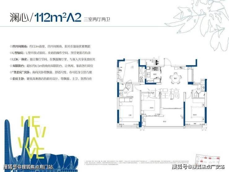 约112㎡三房(中间套):四开间朝南,南向面宽约13.1米;异形阳台、少承重墙设计,中间次卧使用更灵活。