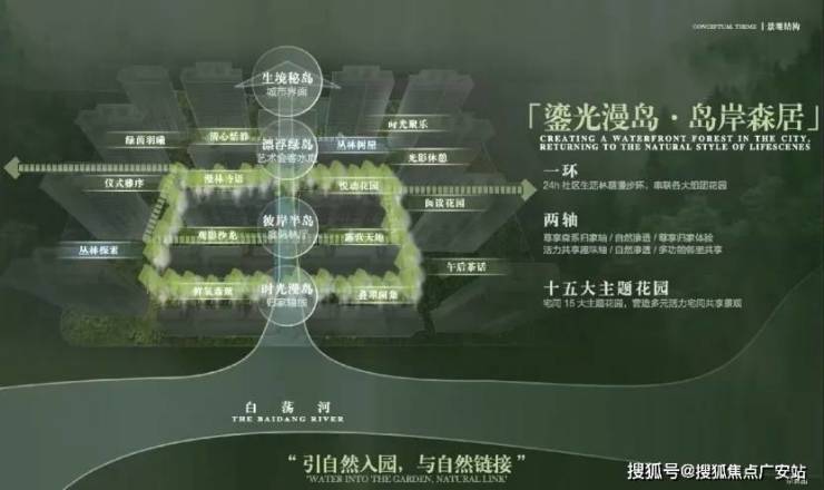 凭借天然河岸、1.8容积率,项目融“山水聚场”理念,规划 “一环二轴十五园”景观布局,以水岸、岛屿、森林、花园、树屋为笔触,演绎“行在景中、坐在岛中、游在林中”的诗画意境。
