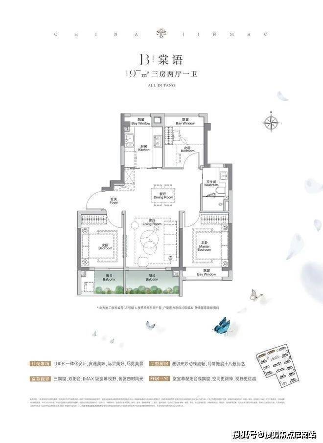上海宝山金茂棠前营销中心热线400-8118-224(官方预约热线)建面约97㎡3房2厅1卫,户型三开间朝南、再加上“3个飘窗+双面阳台系统”,不管是采光、视野、通风、私密性,还是实用性都十分出色。