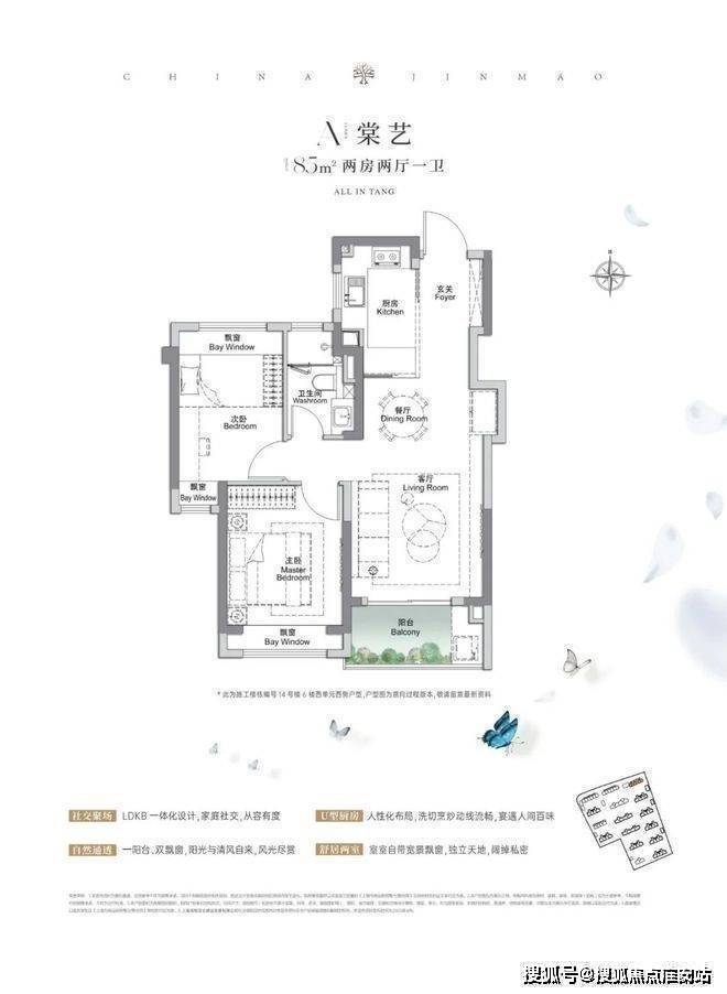 上海宝山金茂棠前营销中心热线400-8118-224(官方预约热线)建面约85㎡2房2厅1卫,做到了双开间朝南+3个飘窗+LDKB一体化设计,附加空间非常多。