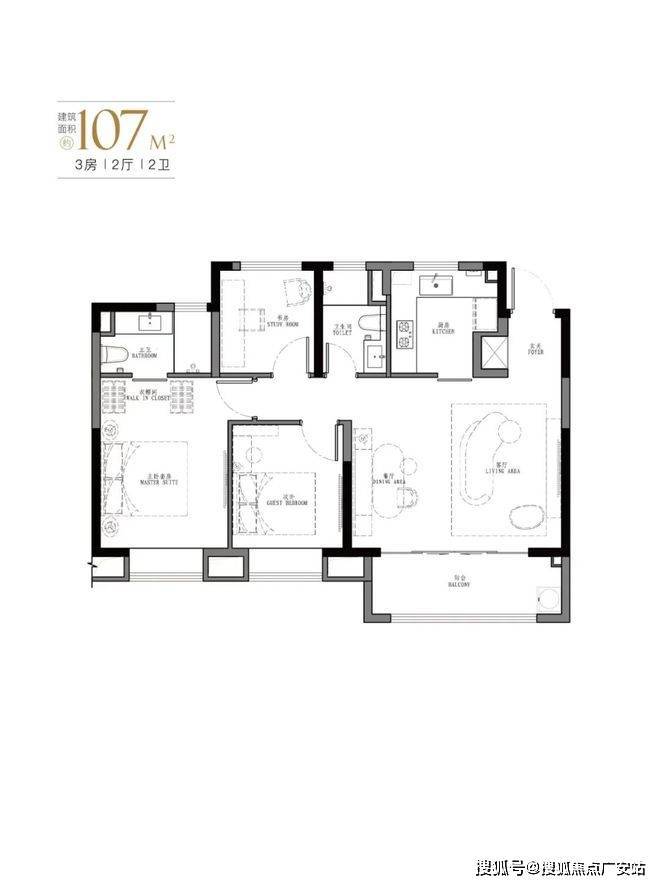 产品:103㎡、107㎡的三房两厅两卫及123㎡、129㎡的四房两厅两卫。