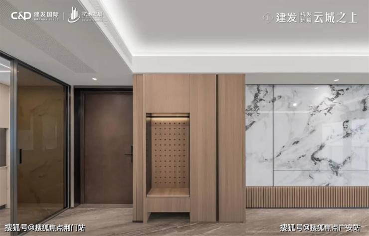 未来交付的标准中,除了全屋墙布外,餐客厅用了大量的仿木纹生态复合板以及大规格的芬迪白岩板背景墙,搭配同色系的玄关柜,豪华感拉满,完全不输市面5万+产品的装修标准。